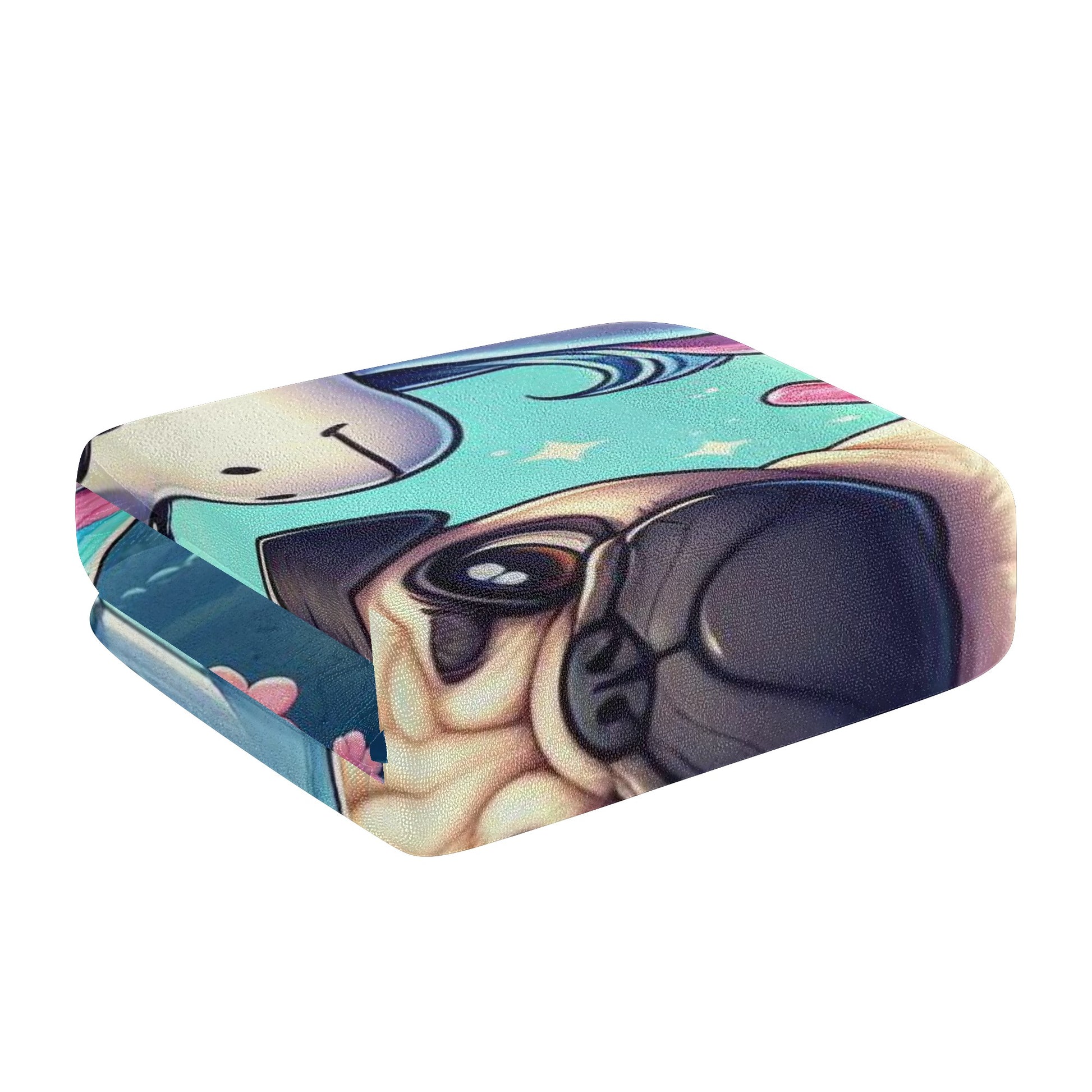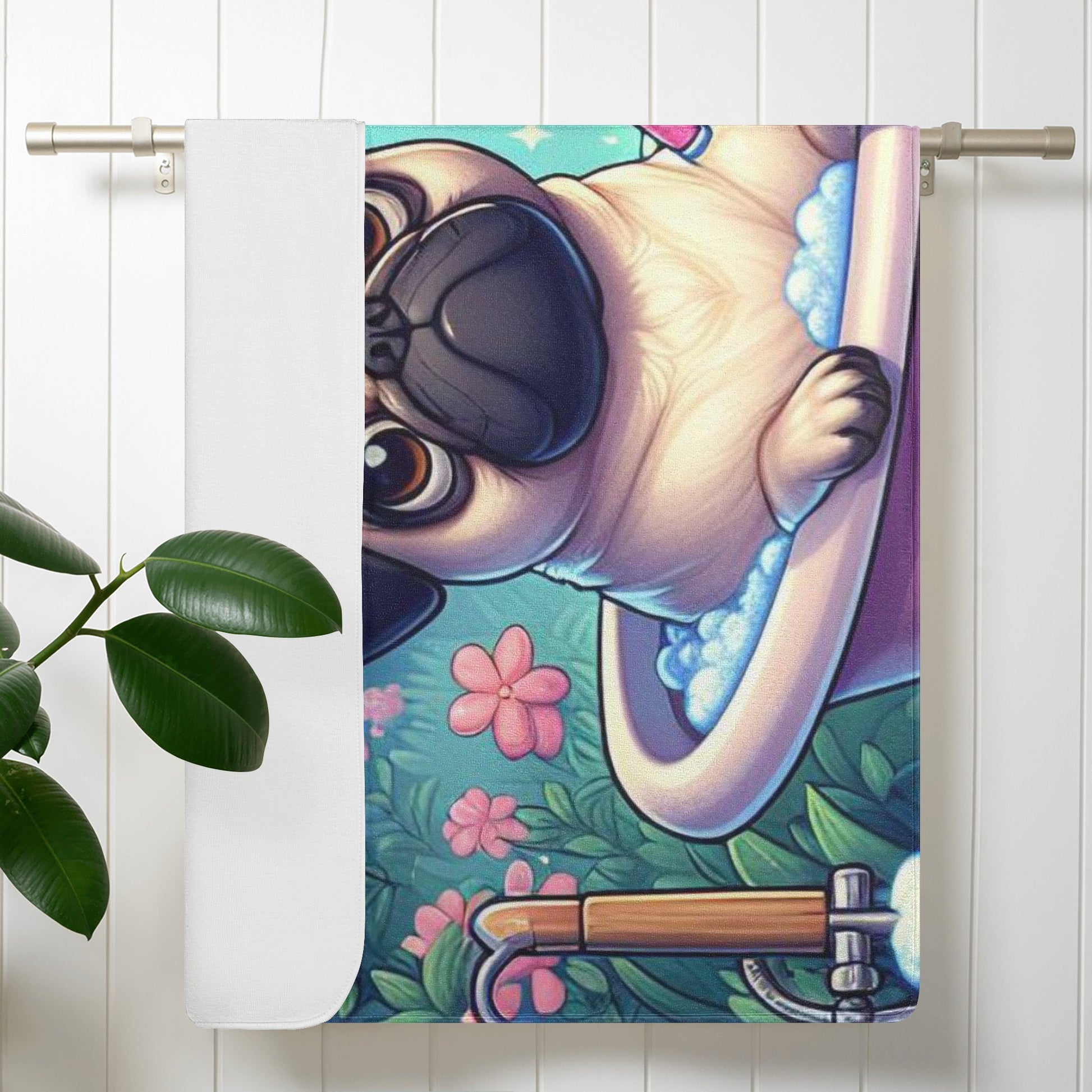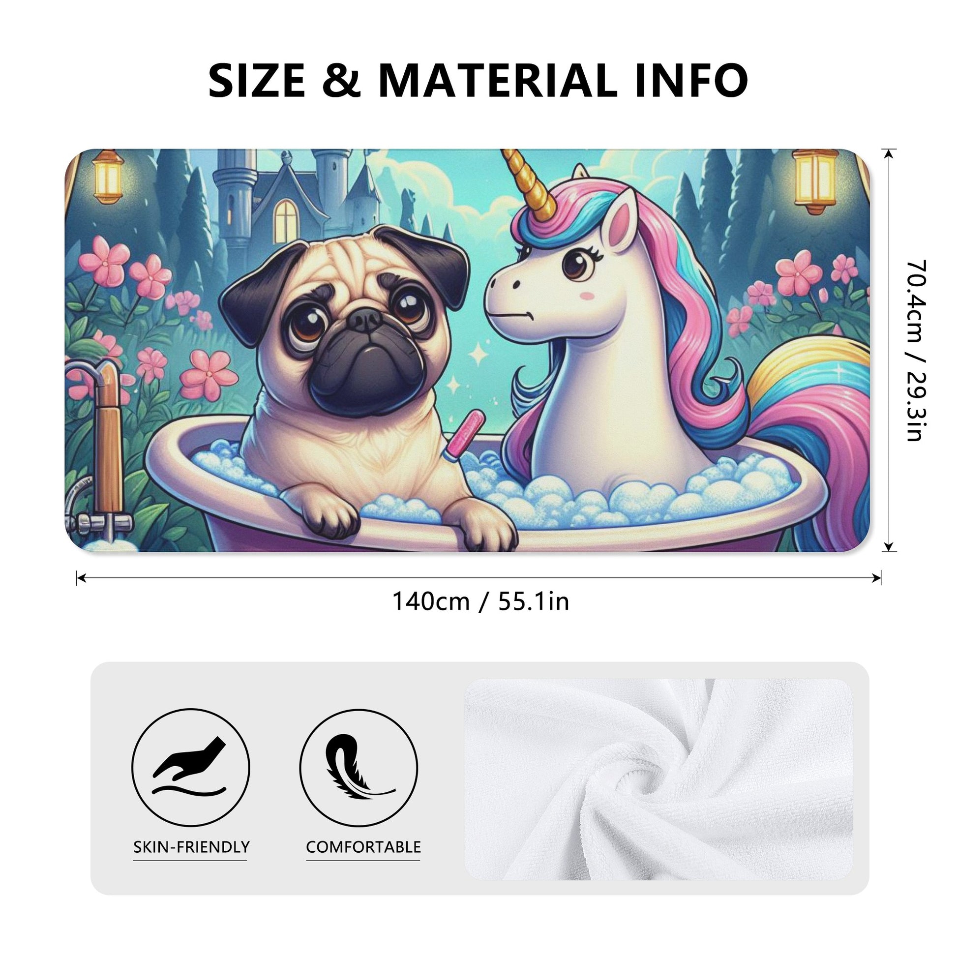 Do you love pugs and unicorns? Then this bath towel is perfect for you! This towel features a cute and colorful scene of a pug dog with a unicorn in a bathtub, surrounded by hearts and bubbles. It will brighten up your bathroom and make your bathing time more fun and relaxing.