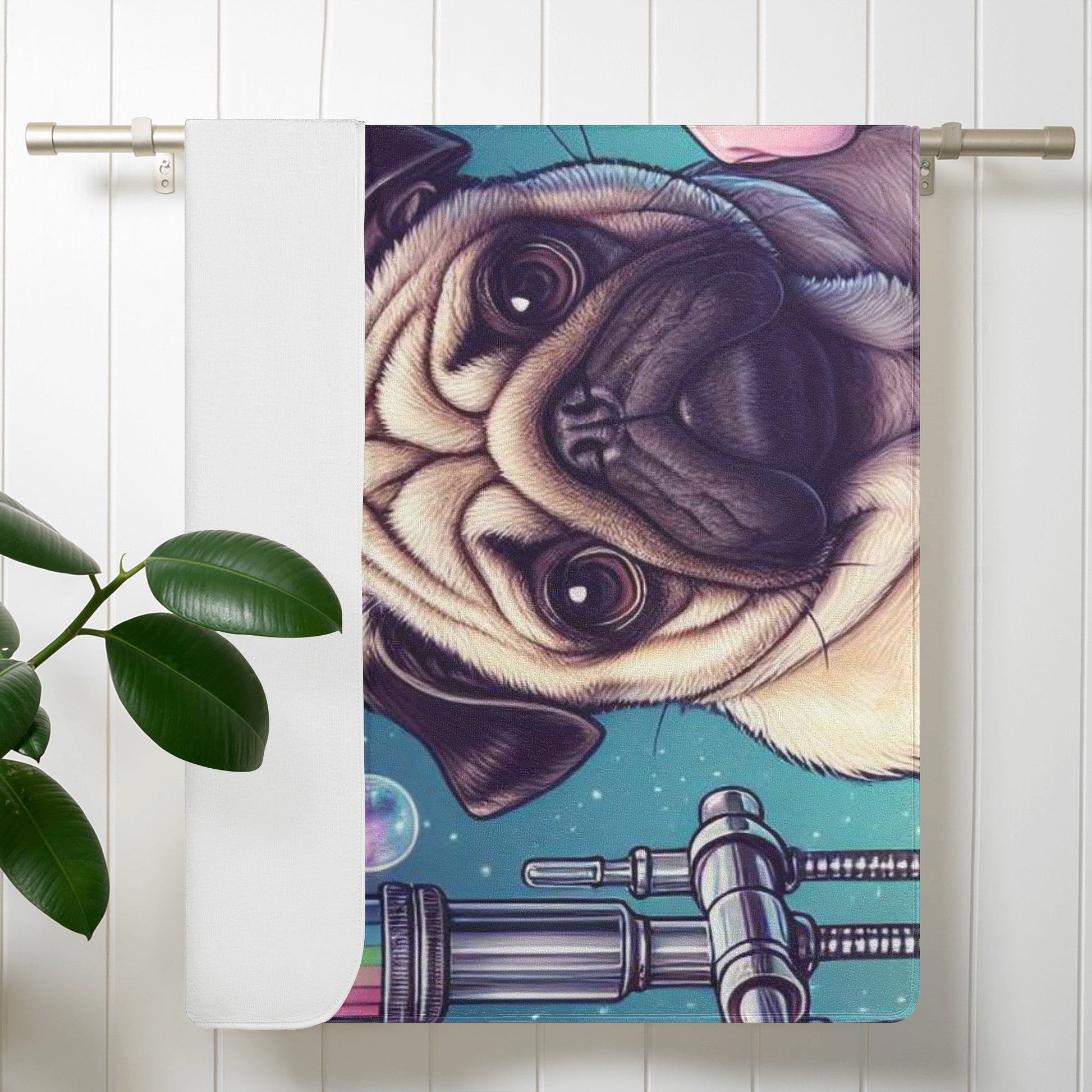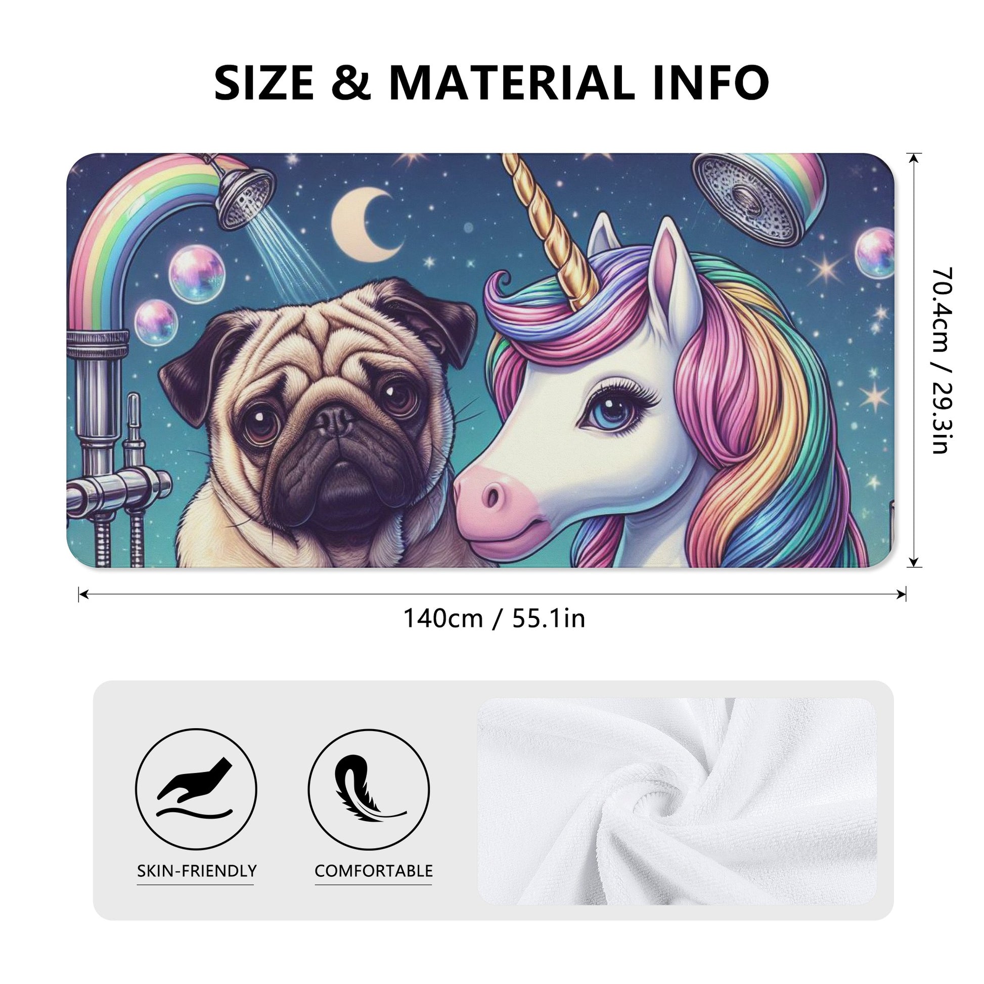 Do you love pugs and unicorns? Then this bath towel is perfect for you! This towel features a cute and colorful scene of a pug dog with a unicorn in a bathtub, surrounded by hearts and bubbles. It will brighten up your bathroom and make your bathing time more fun and relaxing.