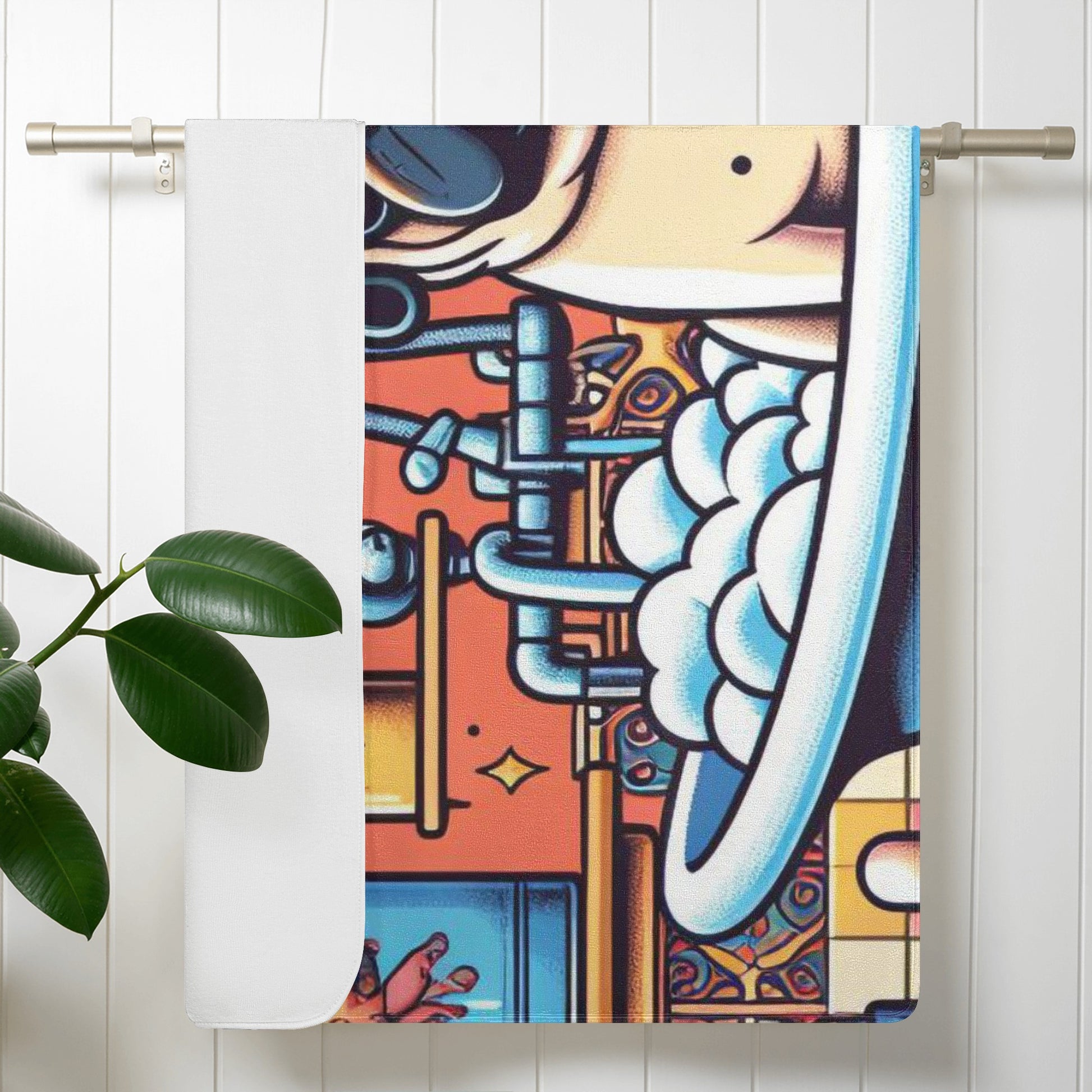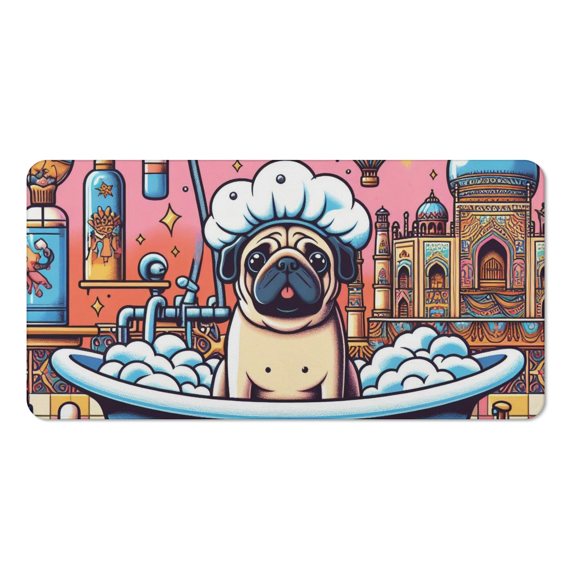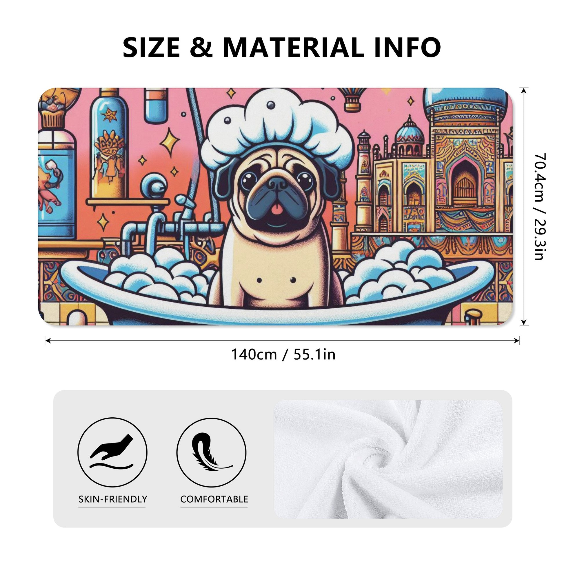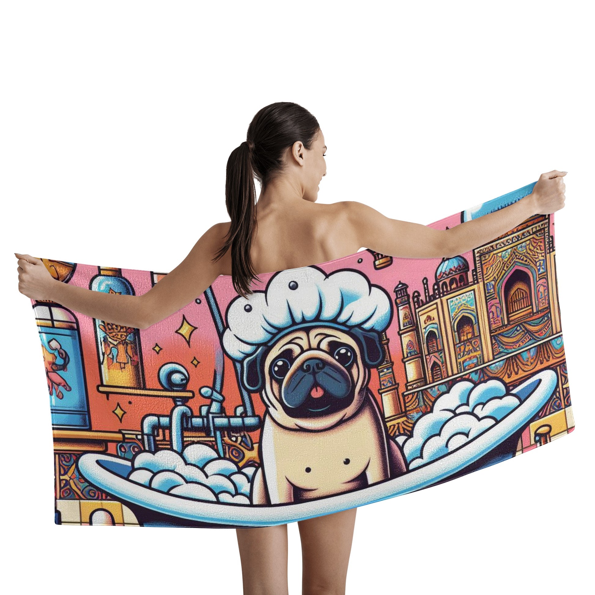 Do you love pugs and unicorns? Then this bath towel is perfect for you! This towel features a cute and colorful scene of a pug dog with a unicorn in a bathtub, surrounded by hearts and bubbles. It will brighten up your bathroom and make your bathing time more fun and relaxing.