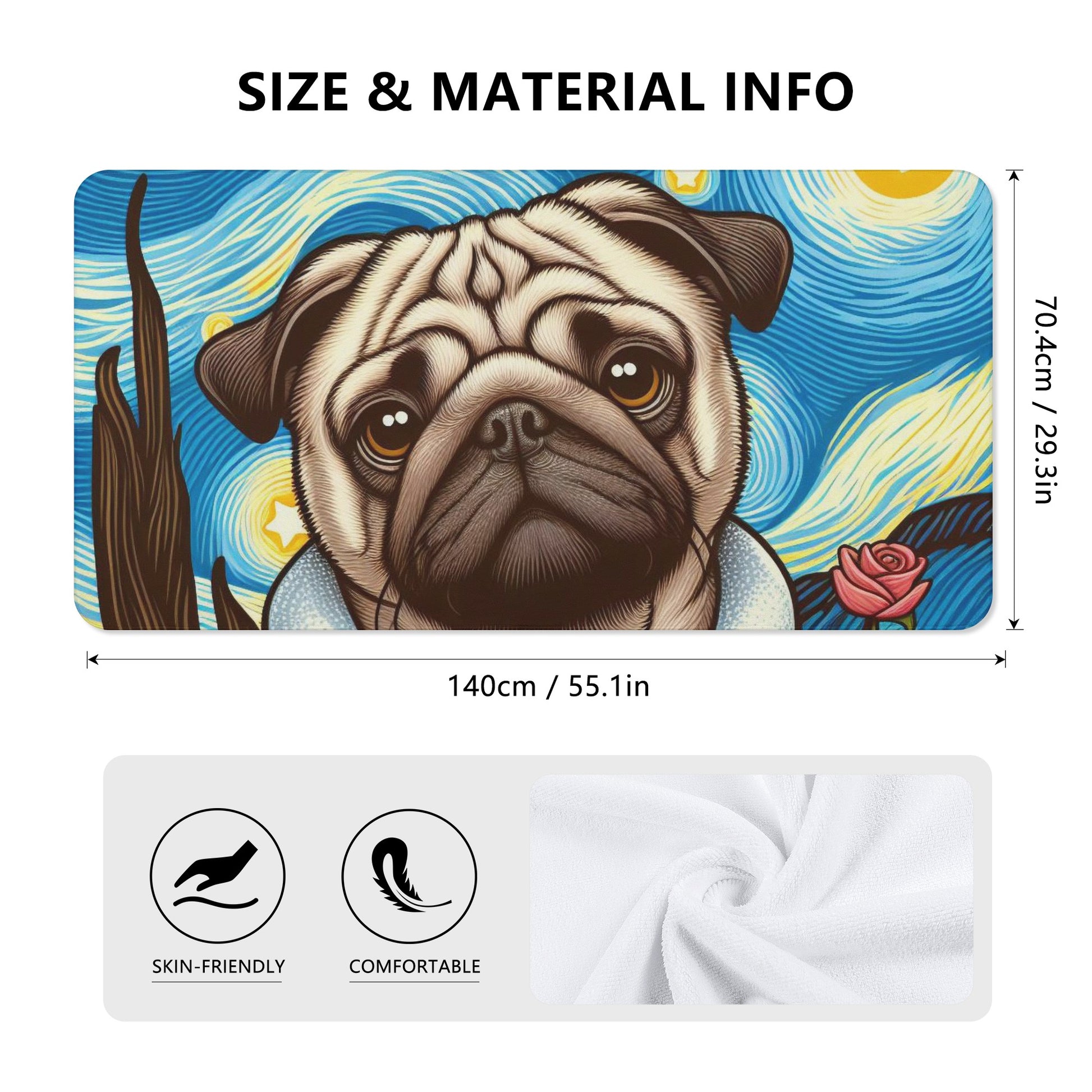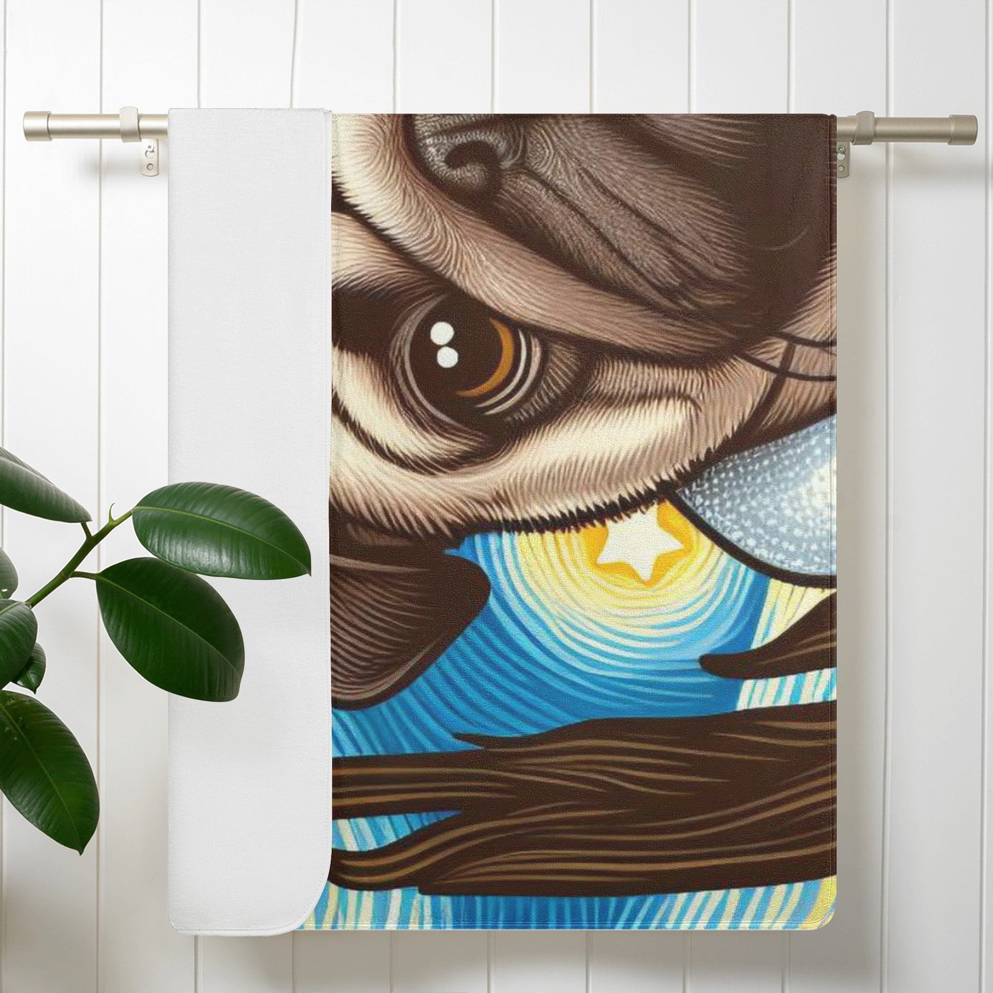 Do you love pugs and unicorns? Then this bath towel is perfect for you! This towel features a cute and colorful scene of a pug dog with a unicorn in a bathtub, surrounded by hearts and bubbles. It will brighten up your bathroom and make your bathing time more fun and relaxing.